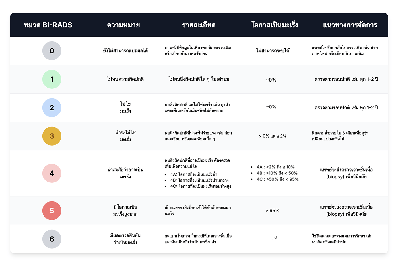 แต่ละหมวด BI‑RADS จะมีความหมายชัดเจนพร้อมแนวทางการจัดการที่สอดคล้องกับโอกาส